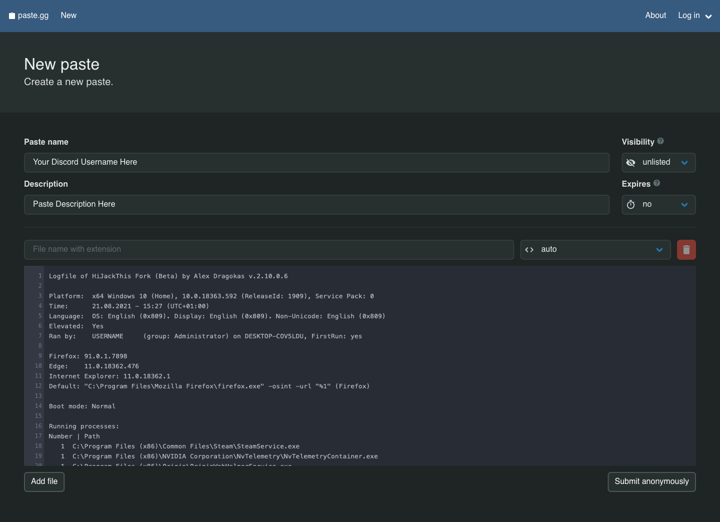 Open https://paste.gg and paste (Ctrl-V or Cmd-V) the contents into the largest field. Put your Discord username into the ‘Paste name’ field, and a description (e.g. ‘HiJackThis report’) in the ‘Description’ field.